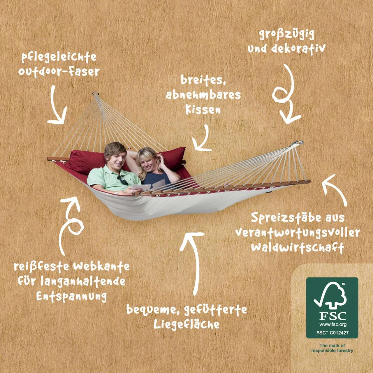 Sie bietet durch die gepolsterte Liegefläche einen hohen Liegekomfort und ist durch ihre Wetterbeständigkeit besonders für den Gebrauch in der freien Natur geeignet. Sie ist aus HamacTex hergestellt, einer speziell für Hängematten entwickelten Polypropylen-Faser. Diese ähnelt der Baumwolle, ist jedoch wetterbeständiger und trocknet schneller. Durch verstärkte Webkanten ist sie besonders reißfest.